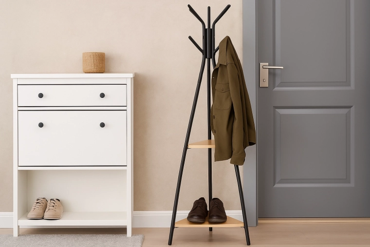 Il metallo nero solido e la base a tre punti assicurano stabilità anche a pieno carico, senza occupare spazio inutile nell’ingresso.