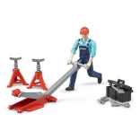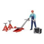 Il set include cric da pavimento, due cavalletti, cassetta degli attrezzi e utensili manuali: tutto il necessario per simulare la riparazione dei veicoli.