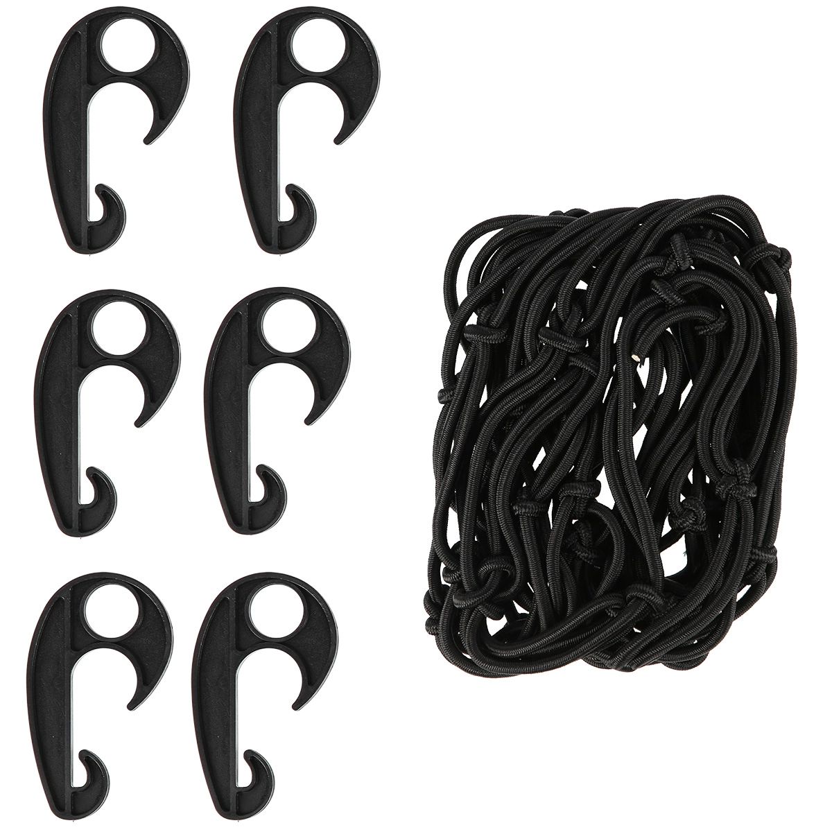 La confezione include 6 ganci in plastica che consentono un fissaggio rapido agli occhielli del carrello, al bagagliaio dell’auto o ad altri punti di ancoraggio. La rete è leggera, compatta e pronta ad aiutare in campeggio, in viaggio e a casa.