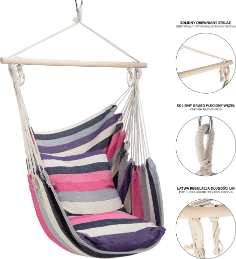 La sedia sospesa brasiliana NILS Camp, con eleganti righe rosa, offre una seduta comoda e un dolce dondolio per rilassare corpo e mente. La parte tessile in tela T/C (60% poliestere, 40% cotone) è piacevole al tatto, traspirante e al tempo stesso resistente all’usura. La barra in legno mantiene la sedia aperta e ben sagomata per un accesso agevole e una seduta sicura.