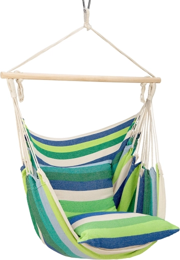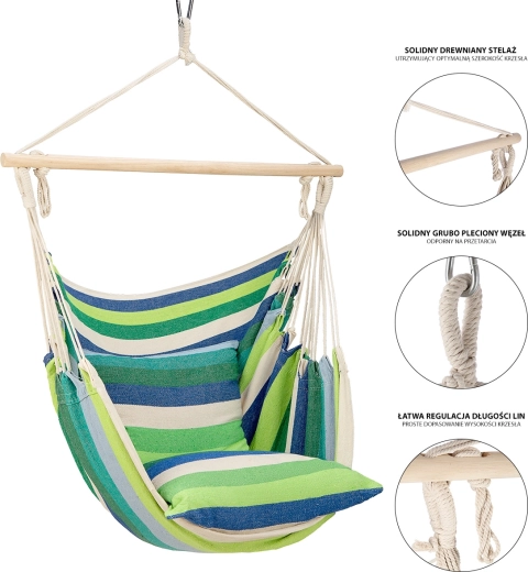 Goditi il relax perfetto a casa e all’aperto con la sedia brasiliana sospesa NILS Camp dal design a righe verdi. La combinazione di cotone e poliestere è piacevole al tatto, traspirante e al tempo stesso resistente. Grazie alla barra stabilizzatrice in legno, alle corde robuste e a due morbidi cuscini, la sedia offre elevato comfort e un dondolio sicuro. Portata 100 kg e facile installazione la rendono una scelta perfetta per giardino, balcone e campeggio.