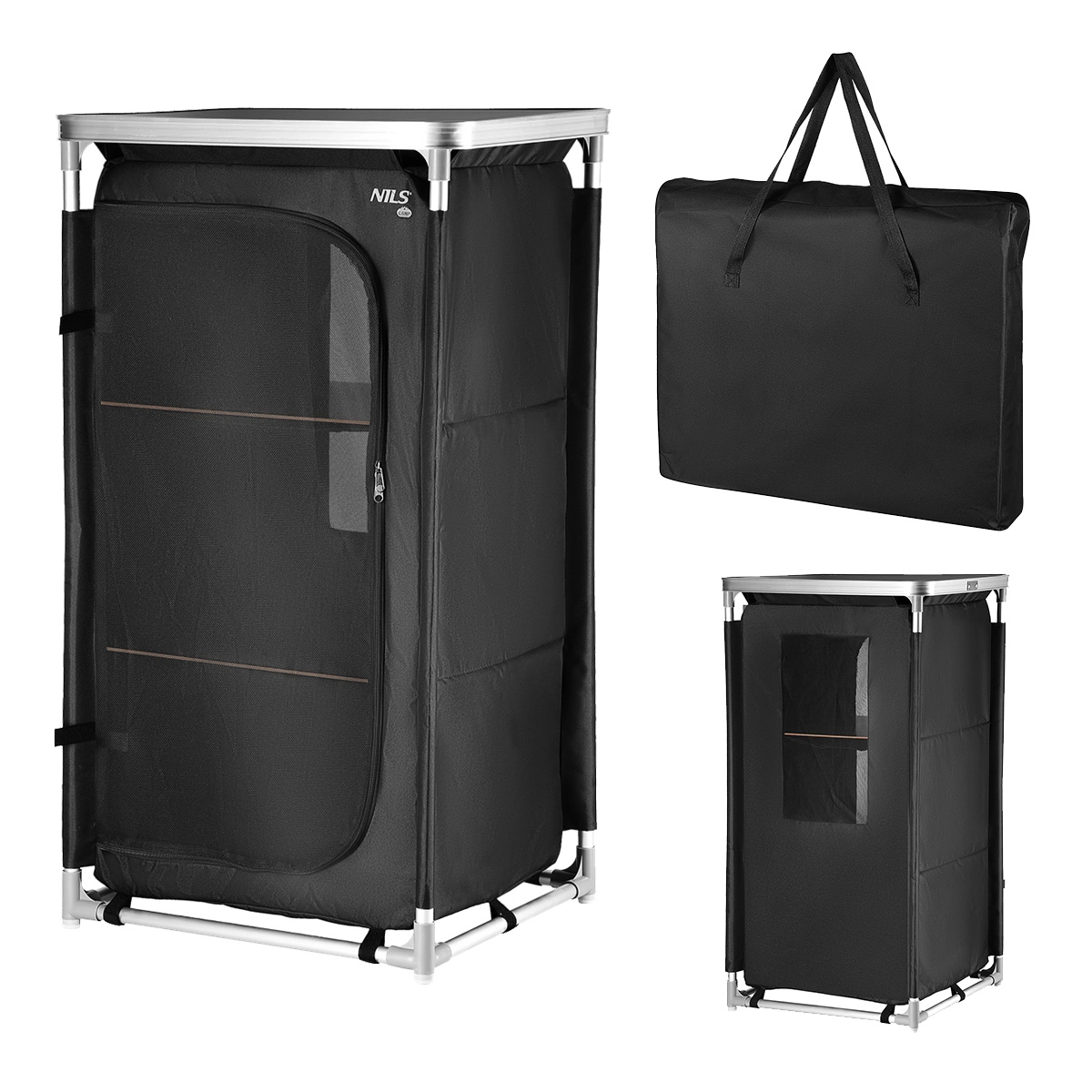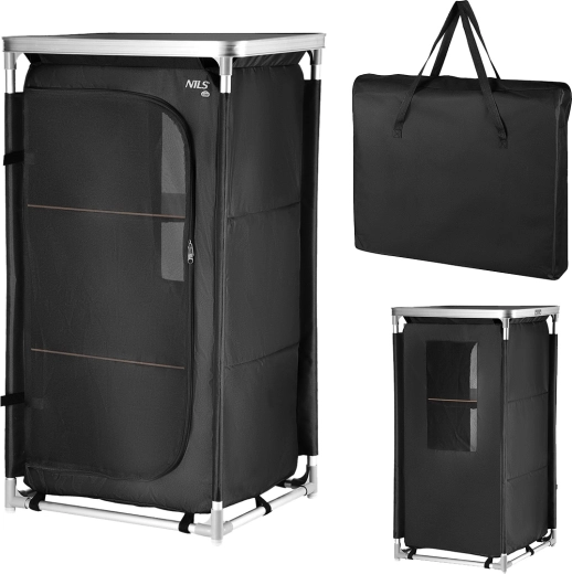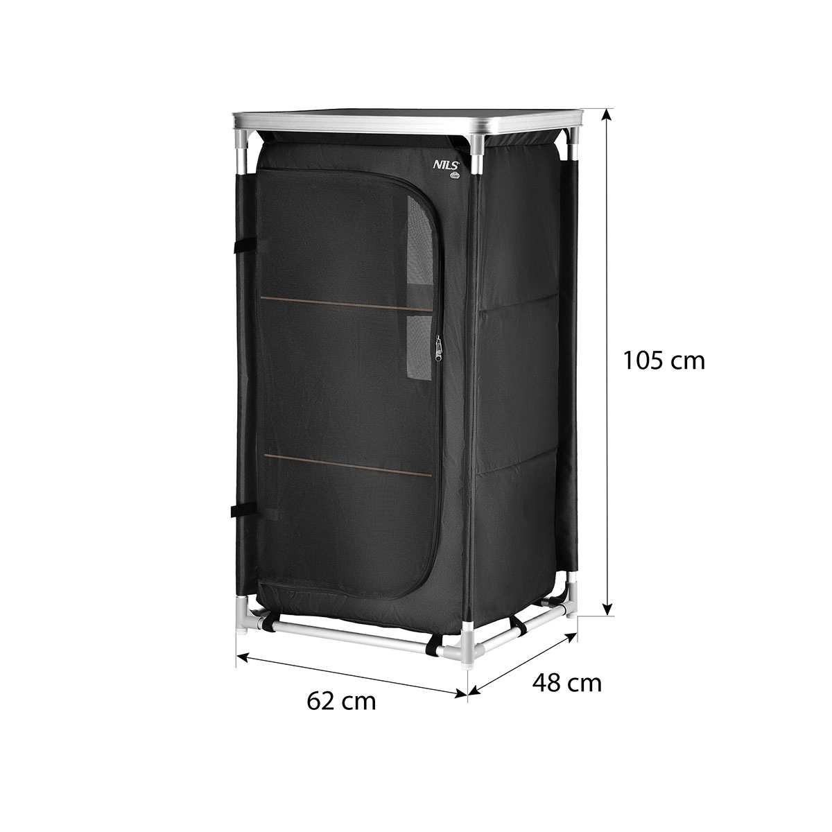 Questo compatto armadio da campeggio NILS CAMP porta ordine in ogni tenda. Il robusto telaio in tubi di alluminio da 19 mm è collegato tramite giunzioni in plastica resistenti, mentre le speciali terminazioni inferiori aumentano la stabilità su superfici irregolari. Il rivestimento in poliestere Oxford 600D è altamente resistente all’usura e agli agenti atmosferici. Il pannello frontale in rete assicura la circolazione dell’aria, può essere arrotolato e fissato con cinghie, oppure chiuso con doppia cerniera.