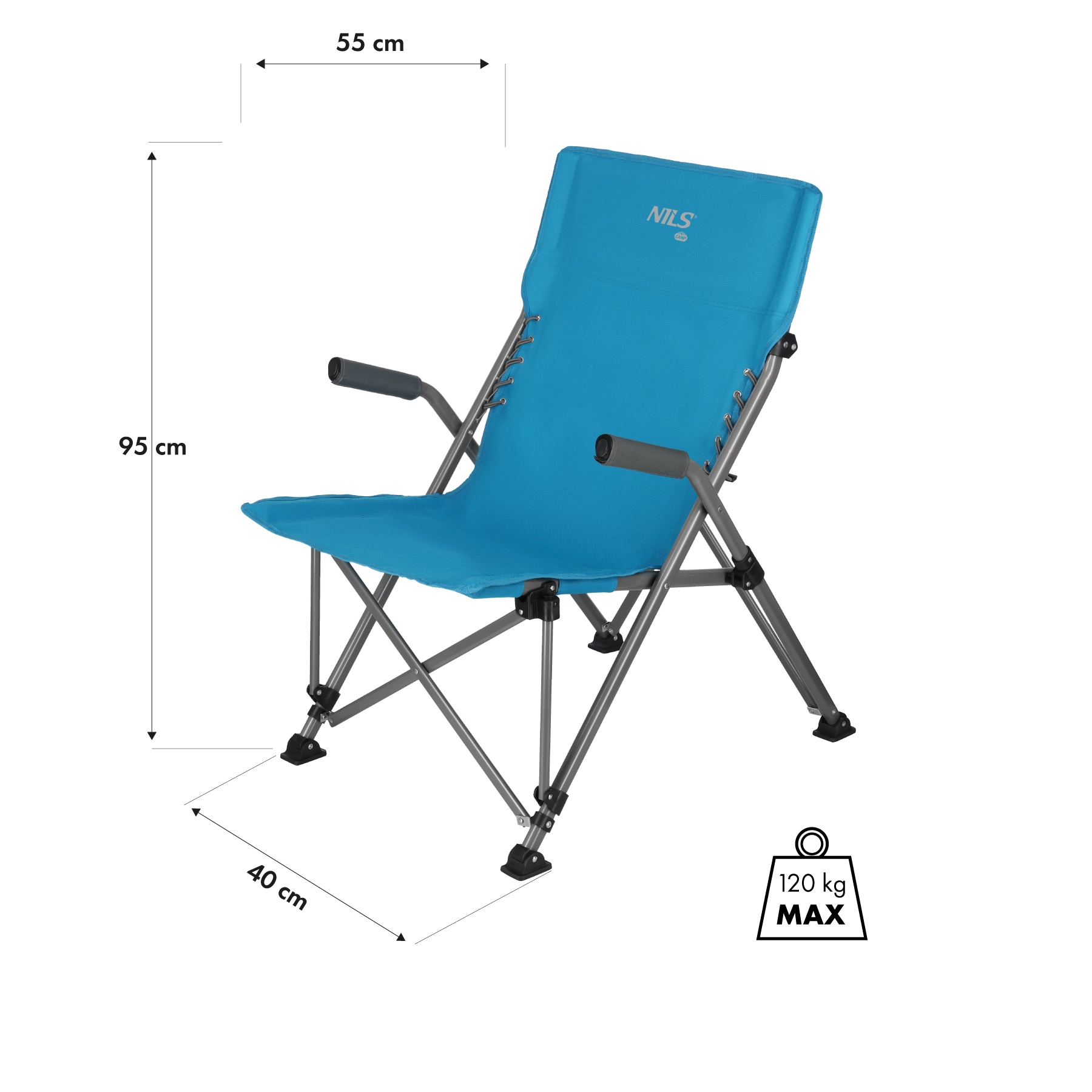 La seduta e lo schienale in materiale Oxford 600D resistono alle condizioni atmosferiche variabili: sono resistenti all'abrasione, all'umidità e ai raggi UV. Il telaio in acciaio con terminali antiscivolo assicura stabilità e un uso in sicurezza fino a 120 kg.