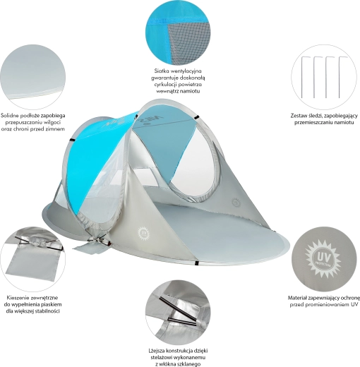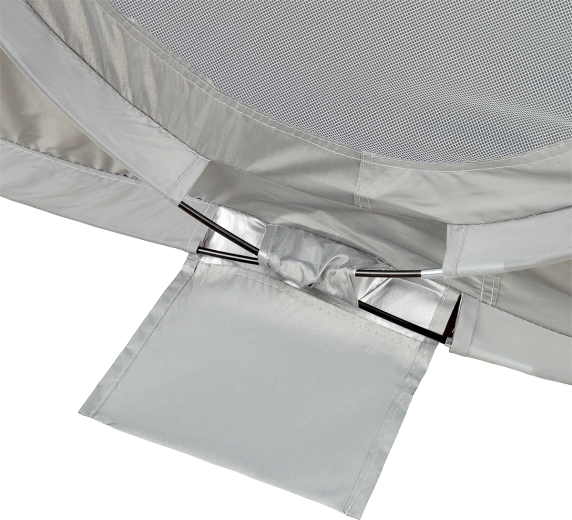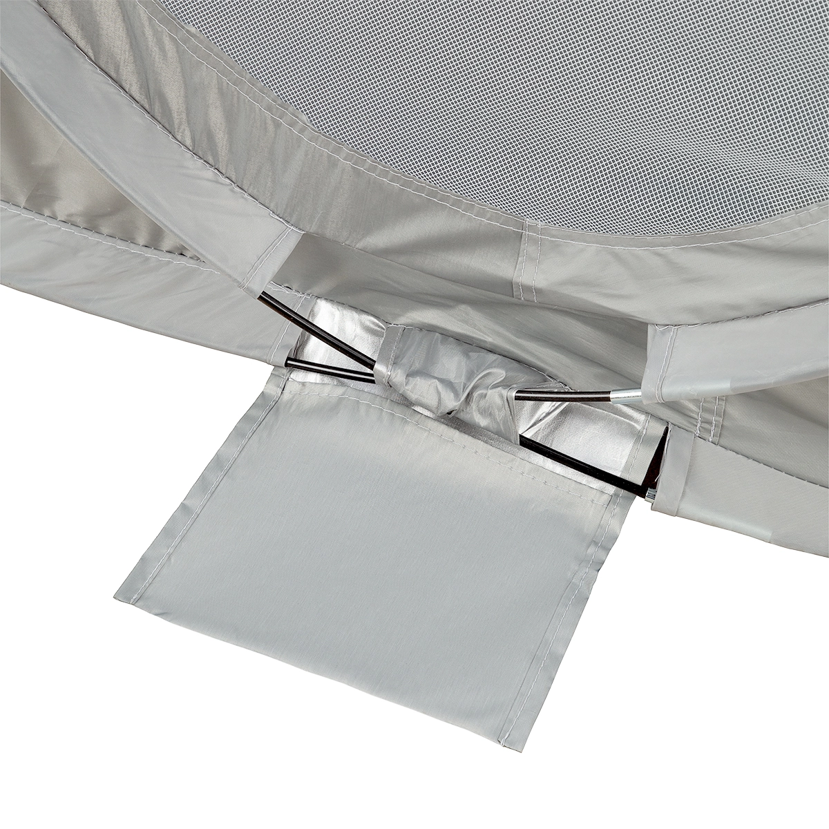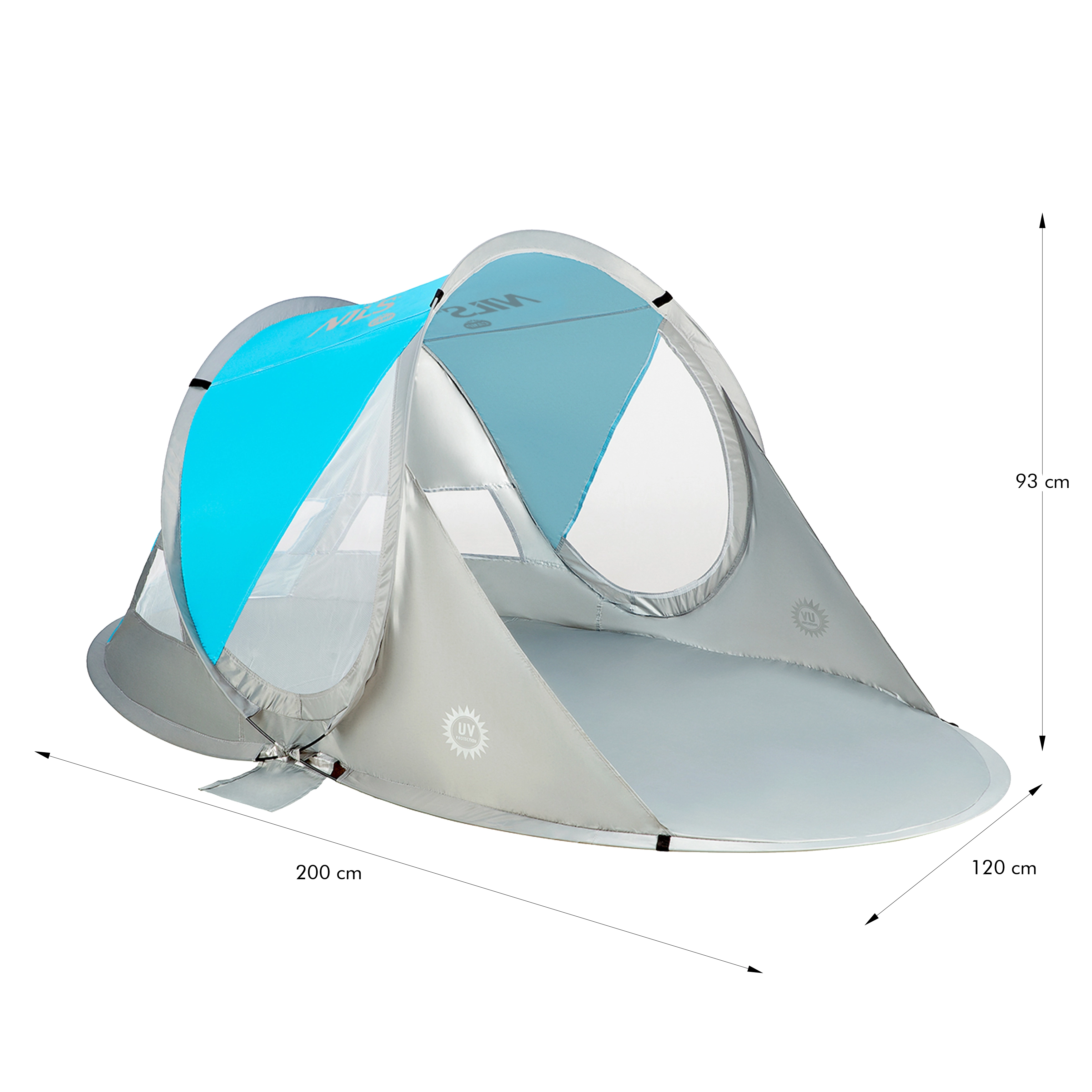 Grazie alla riflettenza UV del 96%, la tenda offre una protezione efficace dai raggi solari nocivi. Il pavimento di 200 × 120 cm e l’altezza di 93 cm offrono spazio sufficiente per sedersi e per il gioco dei bambini. Dopo l’uso, la tenda si richiude facilmente con un semplice gesto nella custodia compatta dal diametro di 60 cm: ideale per un trasporto e uno stoccaggio agevoli.
