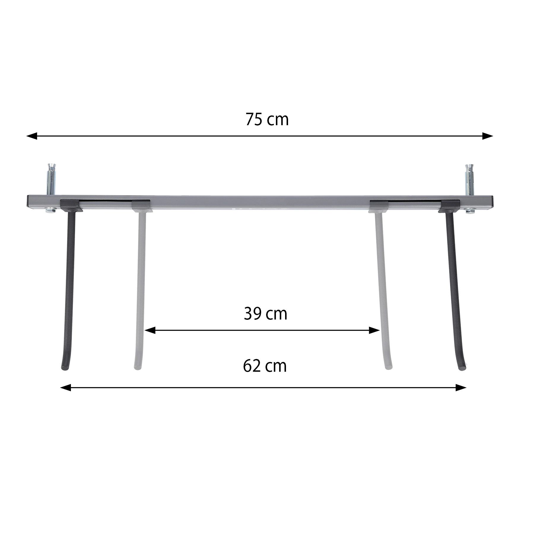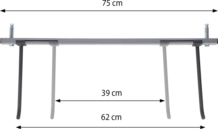 I ganci lunghi 25 cm e l’interasse regolabile 39–62 cm consentono di appendere fino a 16 tappetini (in base allo spessore) e di adattare il supporto a diversi tipi di tappetini con occhielli.