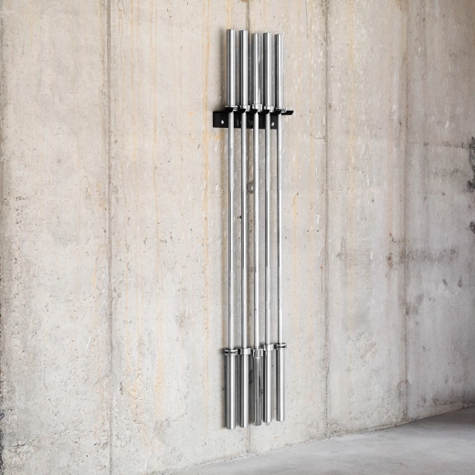 Lo stoccaggio verticale di fino a 5 bilancieri olimpici affiancati libera prezioso spazio a pavimento e mantiene la palestra ordinata.