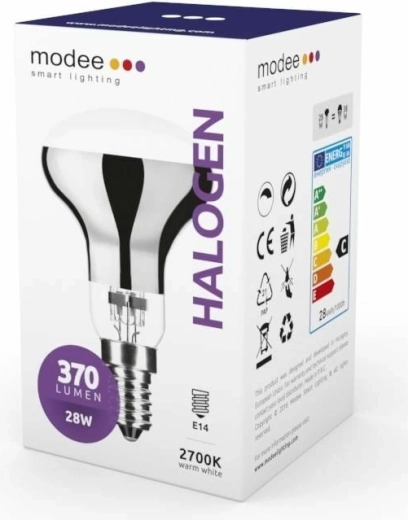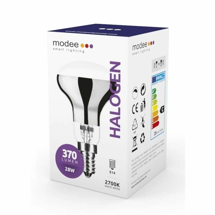 Lampadina alogena a risparmio energetico Modee con attacco E14 e potenza di 28 W, offre luce bianca calda 2700 K, piena luminosità immediata, flusso luminoso dimmerabile e ampio angolo di emissione di 120°. Grazie alla speciale costruzione con rivestimento riflettente IR garantisce maggiore efficienza ed è adatta a qualsiasi apparecchio di illuminazione con attacco E14.