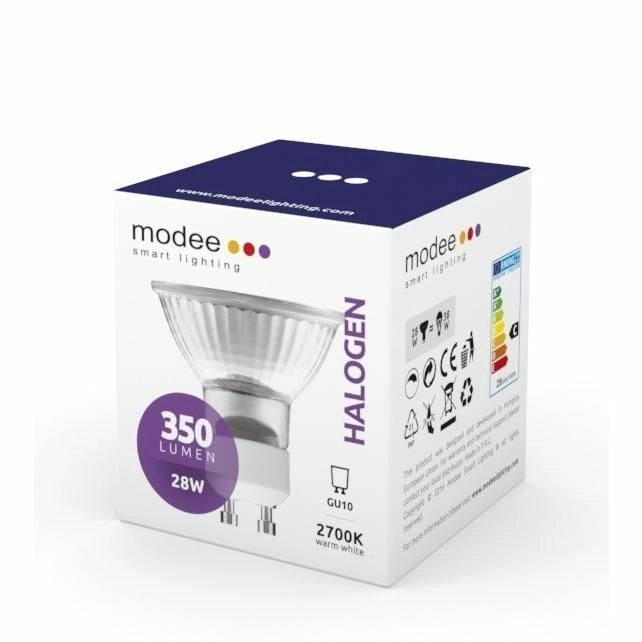 Lampadina alogena a risparmio energetico Modee GU10 28 W con luce bianco caldo 2700 K, offre luminosità piena istantanea, flusso luminoso dimmerabile e un ampio angolo di emissione di 110°. Grazie alla speciale struttura con rivestimento interno riflettente IR e al riempimento con gas xeno, raggiunge una maggiore efficienza ed è ideale per illuminazione a soffitto a punti con flusso luminoso di 350 lm.