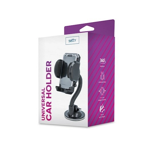 Il supporto universale SETTY è la soluzione ideale per posizionare in modo sicuro e comodo il telefono o il GPS durante la guida. La potente ventosa garantisce un ancoraggio solido e stabile al parabrezza, mentre la struttura flessibile permette il settaggio ottimale dell’angolo per una migliore visibilità e controllo.