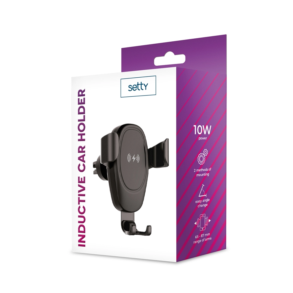 Pratico e supporto da auto a induzione regolabile di SETTY con ricarica wireless da 10 W che mantiene il tuo telefono saldamente in posizione e allo stesso tempo lo ricarica direttamente nel supporto. Offre montaggio sulla griglia di ventilazione e sul cruscotto, rotazione a 360° e apertura bracci 6,5–8,7 cm per un'ampia compatibilità.
