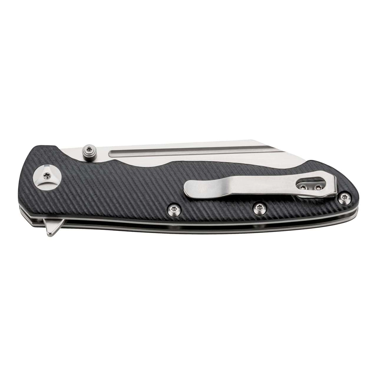 L’impugnatura ergonomica e zigrinata in G10 nero con liner in acciaio garantisce una presa sicura, mentre le scanalature per le dita aumentano il controllo durante il taglio. Il Linerlock blocca in modo affidabile la lama in posizione aperta e la clip da tasca consente un porto discreto e confortevole ogni giorno.
