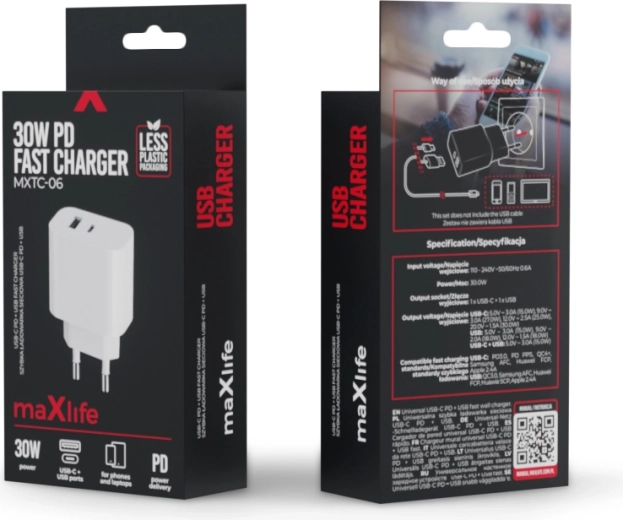 Il caricatore da rete compatto MAXLIFE con potenza di 30 W offre una ricarica rapida e sicura per più dispositivi contemporaneamente. Grazie alle porte USB‑C e USB‑A e al supporto di Power Delivery (PD) e Quick Charge (QC), adatta automaticamente la potenza al dispositivo collegato per la massima efficienza di ricarica.