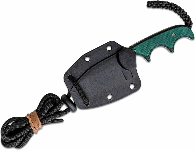 L’impugnatura in Micarta verde‑nera è sagomata per guidare naturalmente il coltello e garantire una presa sicura anche con guanti o in condizioni di umidità. È incluso un fodero resistente con paracord e clip per diversi metodi di porto: al collo, in cintura o sull’equipaggiamento.