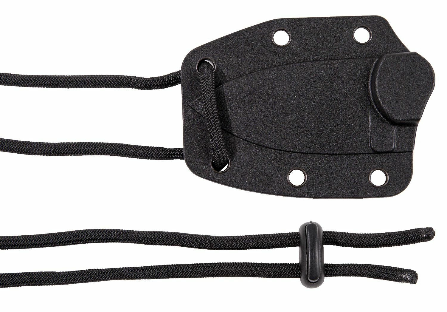 Fodero termoplastico con paracord e clip di montaggio che consente fissaggi versatili al collo, all’equipaggiamento o alla cintura.
