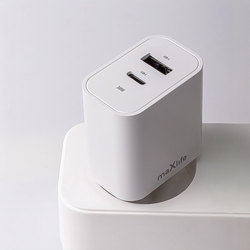 Cerchi un caricatore universale e potente per l’uso quotidiano? Maxlife 30 W unisce un design compatto al supporto dei più moderni protocolli di ricarica rapida. Grazie alla doppia porta USB‑C e USB‑A puoi ricaricare facilmente due dispositivi contemporaneamente, con la massima sicurezza ed efficienza.