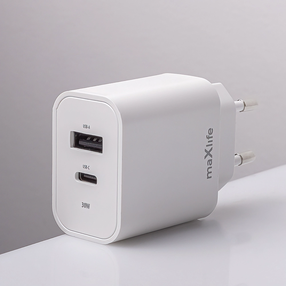 Il caricatore da parete compatto Maxlife 30 W ricarica fino a due dispositivi contemporaneamente tramite USB‑C e USB‑A. Supporta Power Delivery (PD) e Quick Charge (QC) per una ricarica rapida e sicura di smartphone, tablet e notebook più piccoli. L’adattamento automatico della corrente ottimizza la potenza per il tuo dispositivo. Nella confezione è incluso un cavo USB‑C – Lightning 30 W.