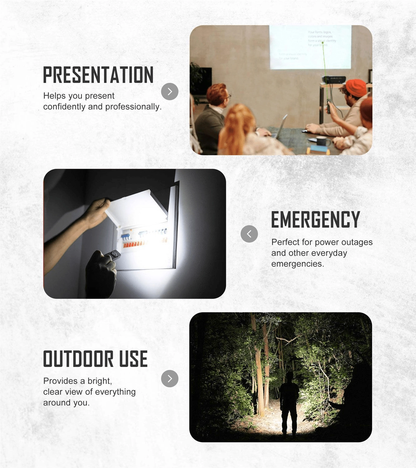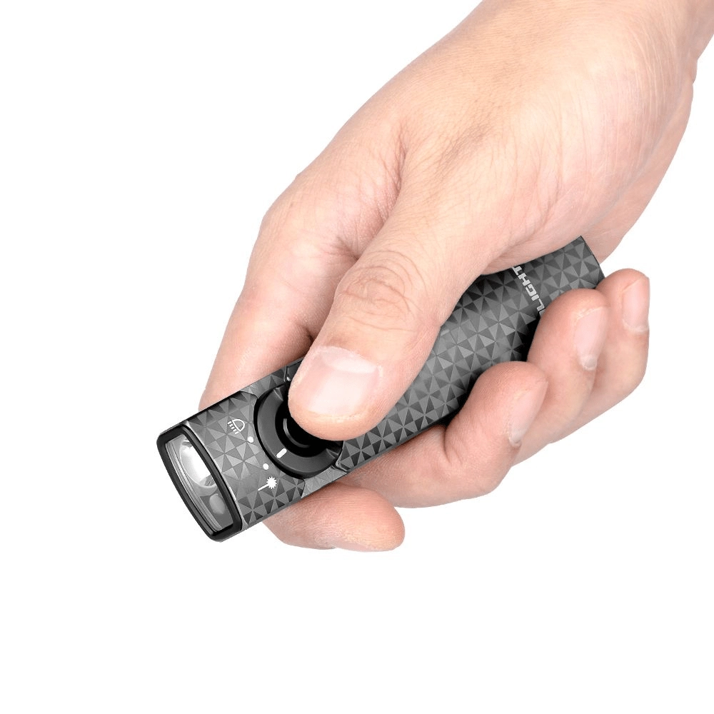 Il corpo elegante e piatto con texture metallica e clip in acciaio assicura una presa salda, un facile trasporto in tasca e un aggancio rapido alla cintura. Il flusso luminoso massimo di 1.000 lumen e una portata fino a 101 metri garantiscono un’illuminazione affidabile in città, in officina e all’aperto. Il laser verde integrato è utile per presentazioni e per giocare con gli animali domestici.
