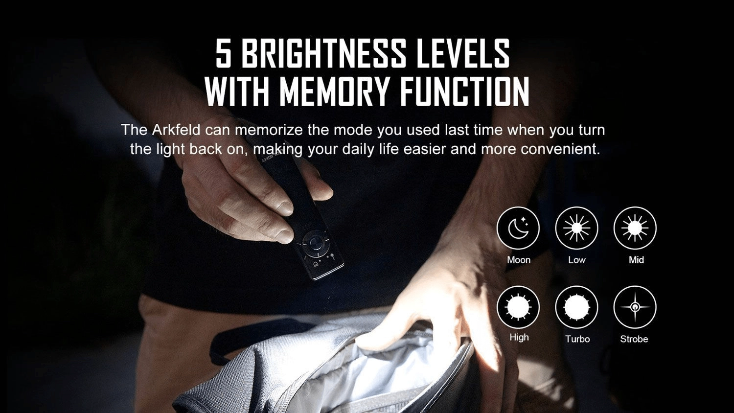 Il pulsante centrale e il selettore delle modalità consentono di passare rapidamente tra cinque livelli di luminosità. La funzione memoria richiama le ultime impostazioni utilizzate.