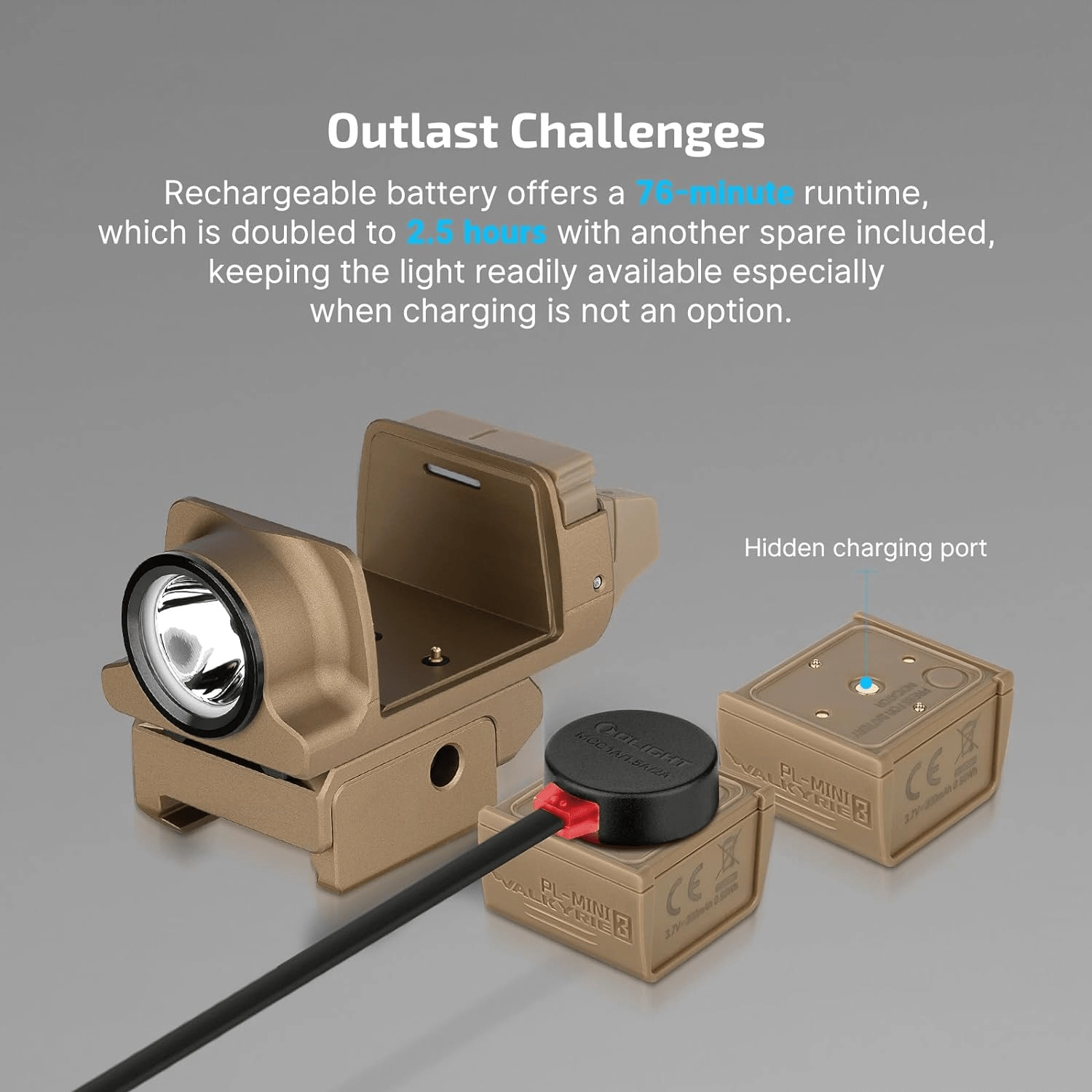 Batteria Li‑Pol integrata da 260 mAh si ricarica tramite cavo magnetico OLIGHT – senza smontare, senza cavi attorno all’arma, sempre pronta all’uso.
