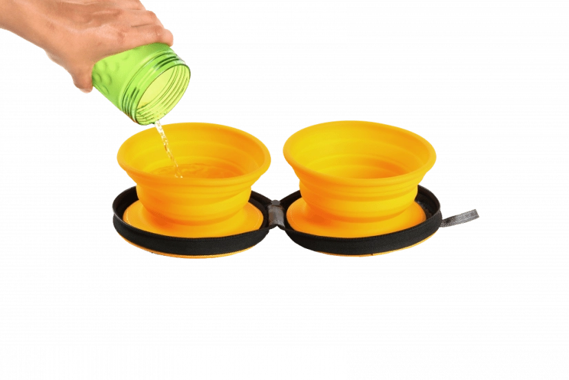 Le ciotole sono fissate all’interno della pratica custodia tramite chiusura a strappo, così restano al loro posto anche in movimento. L’intera custodia si chiude con una solida cerniera, garantendo pulizia e un trasporto comodo in zaino, borsa o auto.