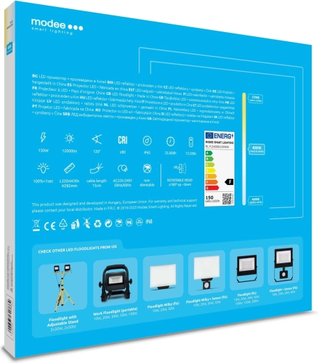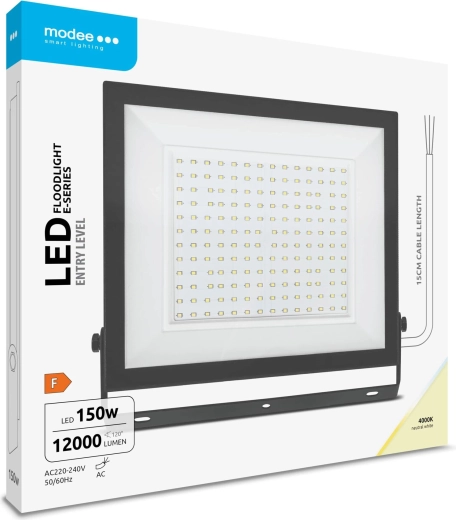 Potente faretto LED da esterno Modee E‑series Slim con 150 W di potenza, flusso luminoso di 12.000 lm e ampio angolo di emissione di 120° per un’illuminazione uniforme di grandi superfici. Grazie al grado di protezione IP65 è resistente a polvere e acqua, funziona a AC 220–240 V e, con temperatura di colore 4000 K (bianco neutro), garantisce una resa cromatica naturale. Il cavo di alimentazione da 15 cm facilita un’installazione rapida e comoda.
