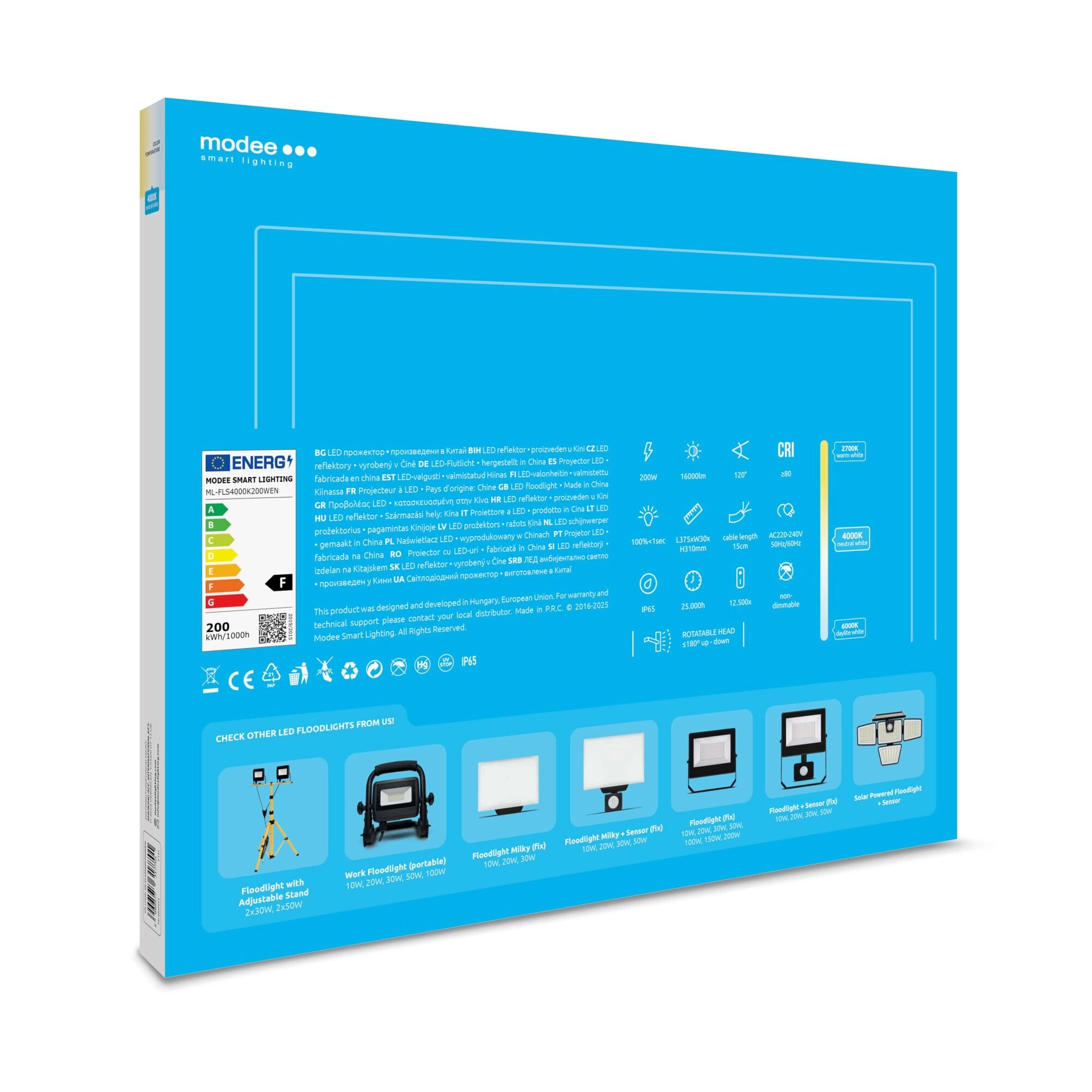 Il faretto MODEE E‑series Slim unisce bassi consumi ad alta resa luminosa. Grazie al flusso luminoso di 16 000 lm e all’angolo di emissione di 120° illumina in modo affidabile rampe di garage, terrazze, giardini, magazzini e reparti produttivi. La temperatura di colore 4000 K (bianco neutro) offre una luce naturale e non affaticante per l’uso quotidiano.
