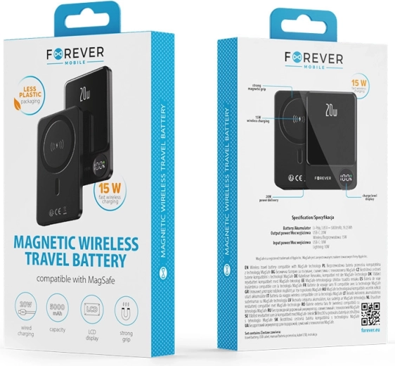 Goditi la libertà senza cavi con la compatta power bank FOREVER che supporta MagSafe e la ricarica wireless dei dispositivi compatibili. Grazie alla capacità di 5000 mAh, all’uscita 20 W Power Delivery via USB‑C e al pratico display LCD, avrai sempre energia e informazioni a portata di mano.
