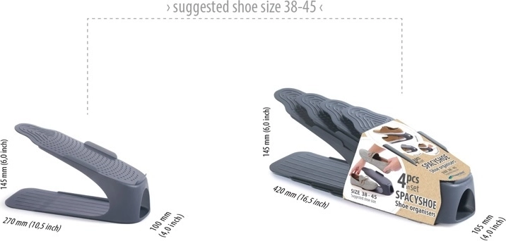 Il set di organizer per scarpe Spacyshoe è una soluzione intelligente per ogni casa. Grazie alla forma innovativa consente di riporre ogni paio sovrapposto, risparmiando efficacemente spazio in armadi, scarpiere e cabine armadio. Il materiale trasparente facilita l'orientamento e l'accesso rapido alle calzature.