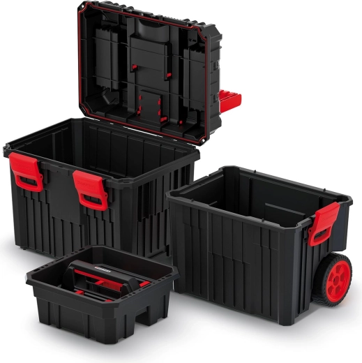 L’interno è organizzato in modo intelligente: sono presenti un cestello estraibile, un portacacciaviti e scomparti per riporre gli attrezzi in modo ordinato. Nel coperchio sono integrati organizer trasparenti con coperchi in policarbonato e divisori rimovibili per i piccoli componenti. Le chiusure in ABS resistenti mantengono la valigia saldamente chiusa durante il trasporto.