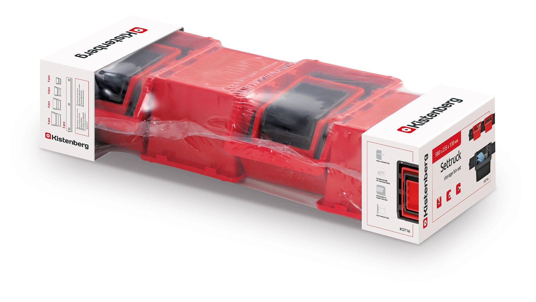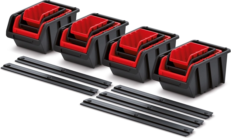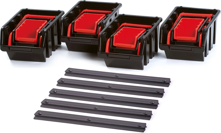 Il pratico set di box da parete SETTRUCK offre organizzazione chiara di piccoli componenti e utensili in officina, garage e in casa. La combinazione di 16 box in plastica resistente in 4 dimensioni e 5 guide di montaggio consente un utilizzo efficiente dello spazio, accesso rapido al contenuto e una disposizione modulabile in base alle tue esigenze. La miscela polimerica resistente garantisce lunga durata e resistenza ai danni meccanici, mentre la colorazione nera/rossa facilita la classificazione visiva.