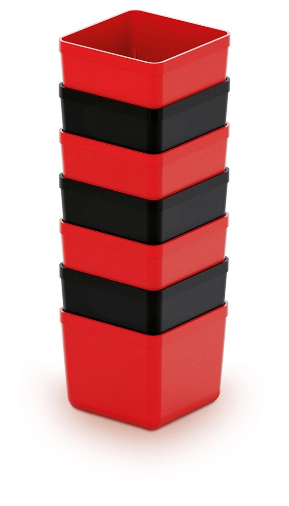 Pratico set di 7 mini box in plastica per piccoli utensili e minuteria in un vivace colore rosso. Ideale per officina, garage e casa. La struttura resistente garantisce lunga durata e un’organizzazione ordinata. Dimensioni di un singolo box: 55 × 55 × 165 mm.