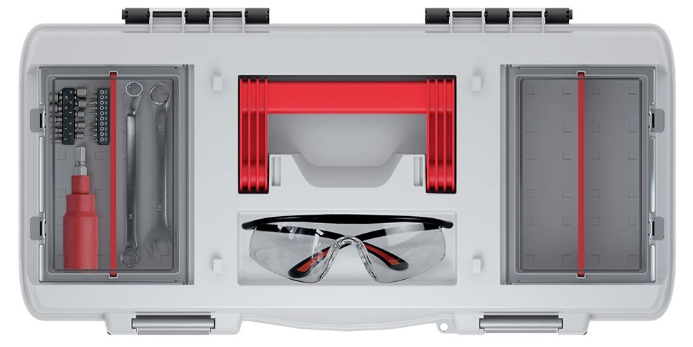 Grazie al vassoio estraibile puoi adattare facilmente lo spazio interno alle esigenze del momento e accedere rapidamente agli utensili più usati. Le dimensioni 476 × 260 × 256 mm offrono spazio sufficiente per attrezzature sia standard che più voluminose, mantenendo al contempo un’elevata facilità di trasporto.