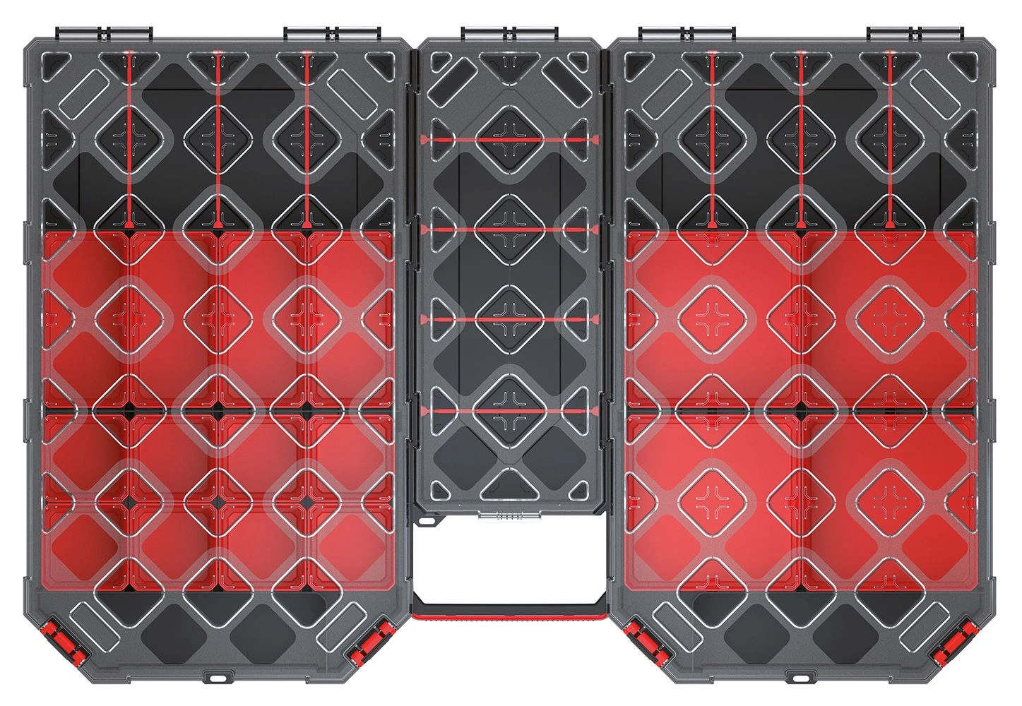 Organizer pratico e resistente per officina, casa e hobby. Grazie alle dimensioni 577 × 390 × 60 mm offre spazio sufficiente per viti, tasselli o piccoli utensili, mentre il coperchio trasparente in policarbonato garantisce una rapida visione del contenuto e una chiusura affidabile.