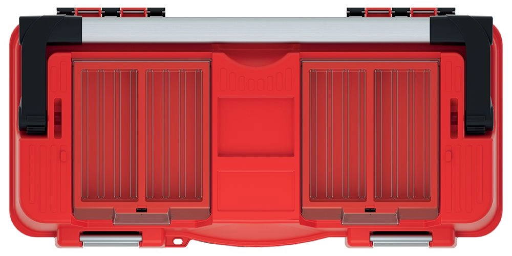 L’organizzazione interna intelligente fa risparmiare tempo e spazio: il vassoio estraibile è ideale per gli strumenti usati più spesso, mentre i due organizer trasparenti nel coperchio ospitano viti, chiodi e piccoli componenti. La maniglia in metallo offre una presa comoda e sicura e la coppia di chiusure in alluminio protegge in modo affidabile il contenuto durante il trasporto.
