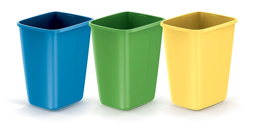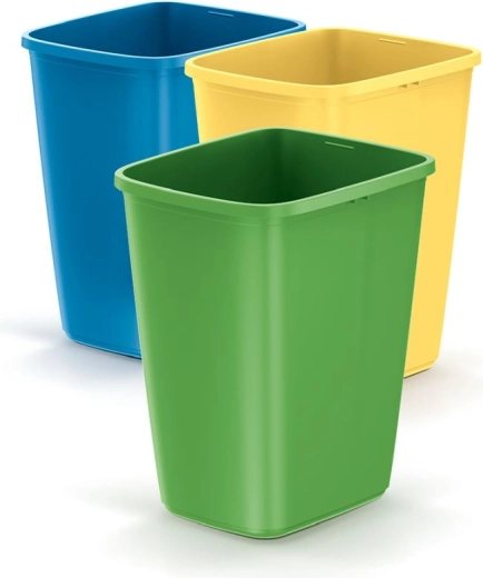 Pratico set di tre bidoni da 3×9 l in plastica resistente per una raccolta differenziata facile e igienica anche negli spazi ridotti. La differenziazione cromatica (blu, verde, giallo) garantisce una separazione chiara, il design aperto senza coperchio consente un inserimento e uno svuotamento rapidi e la superficie liscia si pulisce con facilità. Le dimensioni compatte sono ideali per cucine, uffici e laboratori.