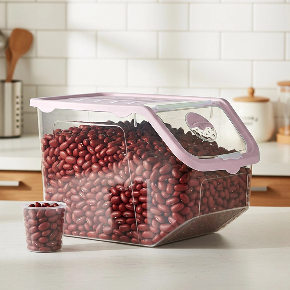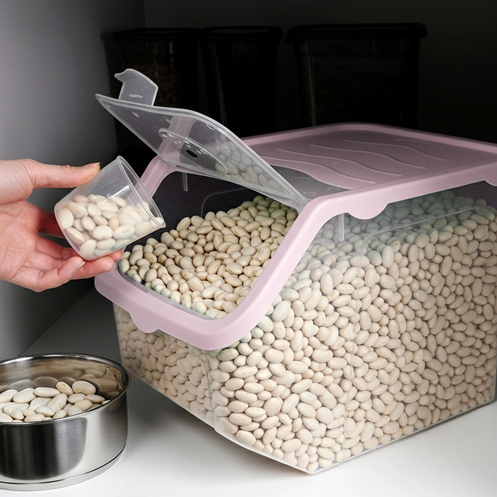 Lo sportellino ribaltabile con maniglia consente di prelevare la quantità necessaria senza rimuovere il coperchio. Ideale per l’uso quotidiano e per mantenere l’ordine nella dispensa.