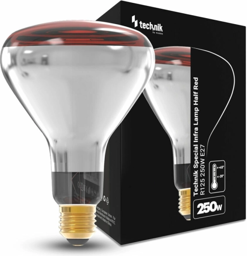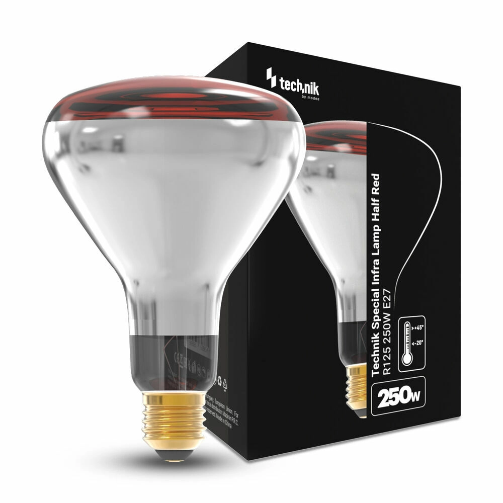 Potente lampadina a infrarossi Modee TECHNIK con attacco E27 e potenza 250 W, ideale per riscaldamento e applicazioni terapeutiche, non per l’illuminazione domestica ordinaria. Offre funzione dimmerabile, robusta struttura in vetro e forma R125 per un’efficiente direzione del calore.