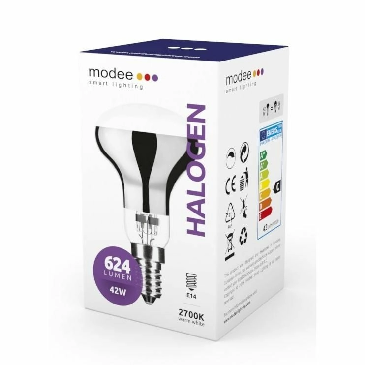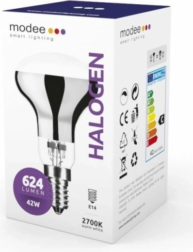 Lampadina alogena R50 a risparmio energetico con attacco E14 e potenza di 42 W, offre piena luminosità istantanea, flusso luminoso dimmerabile 624 lm e luce bianco caldo 2700 K. Grazie al ampio angolo di emissione di 120° illumina perfettamente l’ambiente e la costruzione speciale con riflessione IR aumenta l’efficienza. Classe energetica C, durata fino a 2000 h.