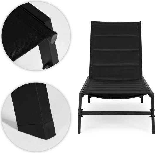 Il robusto telaio in acciaio verniciato a polvere resiste all’uso quotidiano e agli agenti atmosferici. La superficie di appoggio in textilene traspirante con schiuma PP è piacevole al tatto, non assorbe l’umidità e asciuga rapidamente. I piedini antiscivolo aumentano la stabilità su piastrelle e superfici in legno.