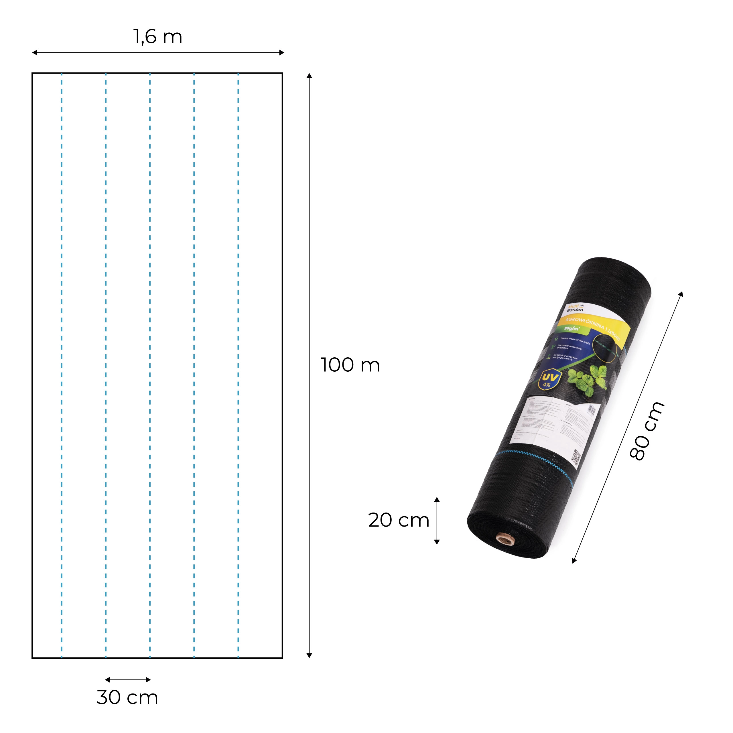 Le pratiche linee guida ogni 30 cm aiutano a organizzare con precisione i trapianti: le apprezzerai nelle aiuole ornamentali, nei filari dell’orto e sotto arbusti e tuje. La confezione include 50 picchetti di montaggio, grazie ai quali potrai ancorare il tessuto facilmente e saldamente contro il vento e lo scorrimento sotto la pacciamatura.