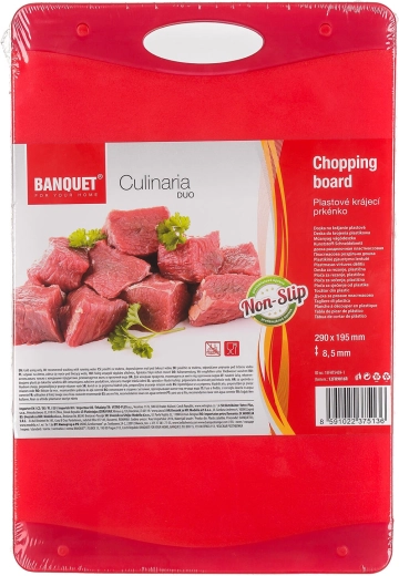 Pratico tagliere CULINARIA DUO nelle dimensioni 37 × 25,5 cm, realizzato in plastica resistente e dotato di finitura antiscivolo per un taglio sicuro. Grazie alla facile manutenzione e alla compatibilità con coltelli in acciaio e ceramica, è la scelta ideale per ogni cucina. Il design bicolore in due tonalità di rosso aggiunge stile alla tua cucina.