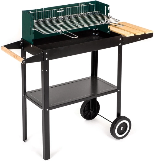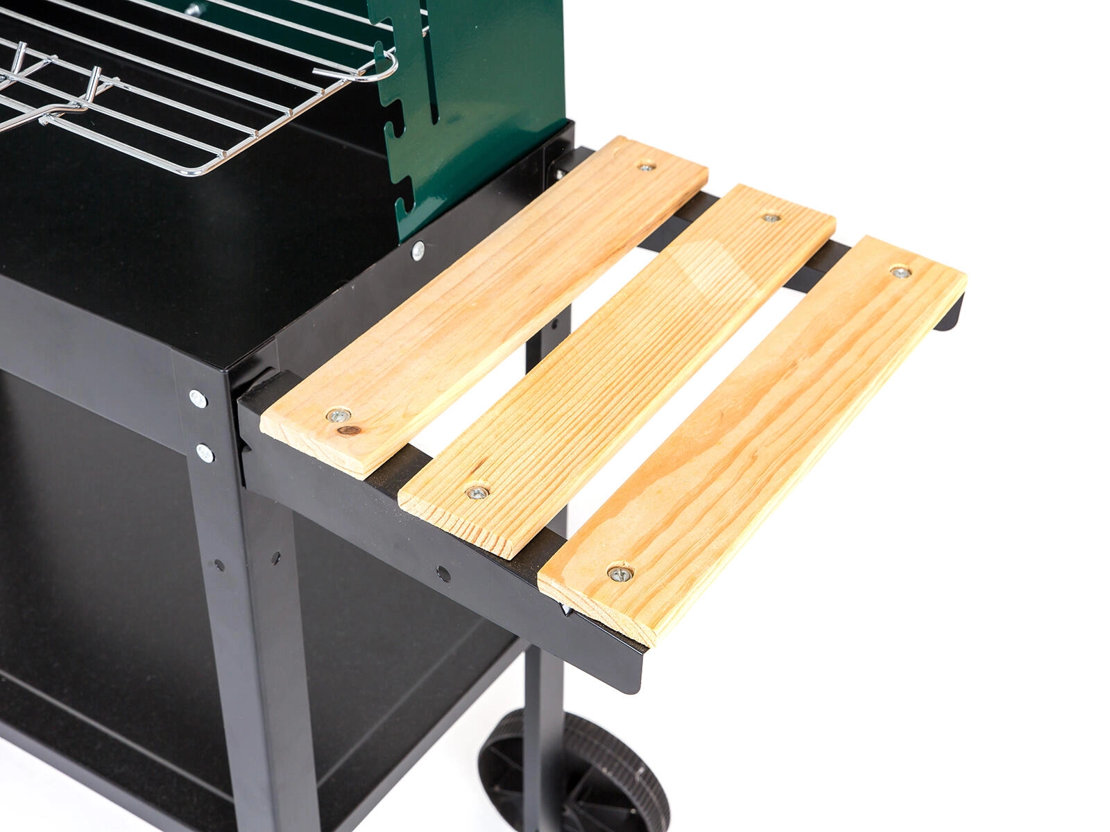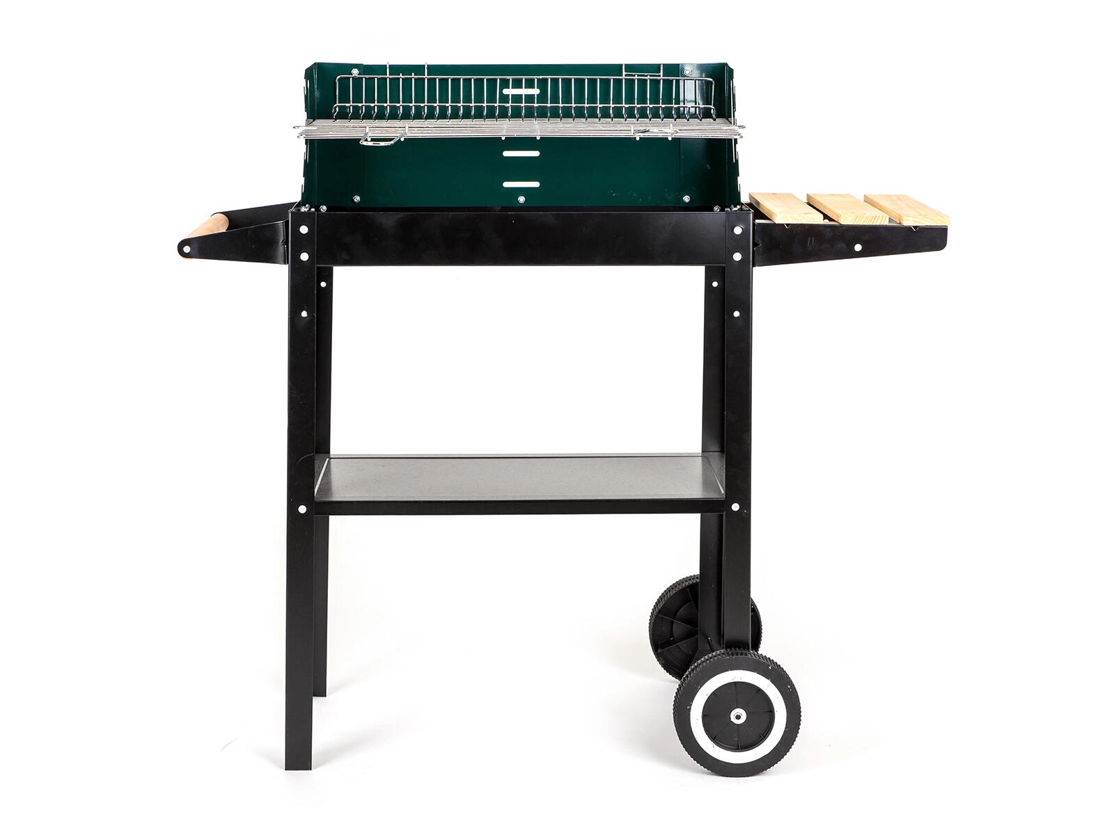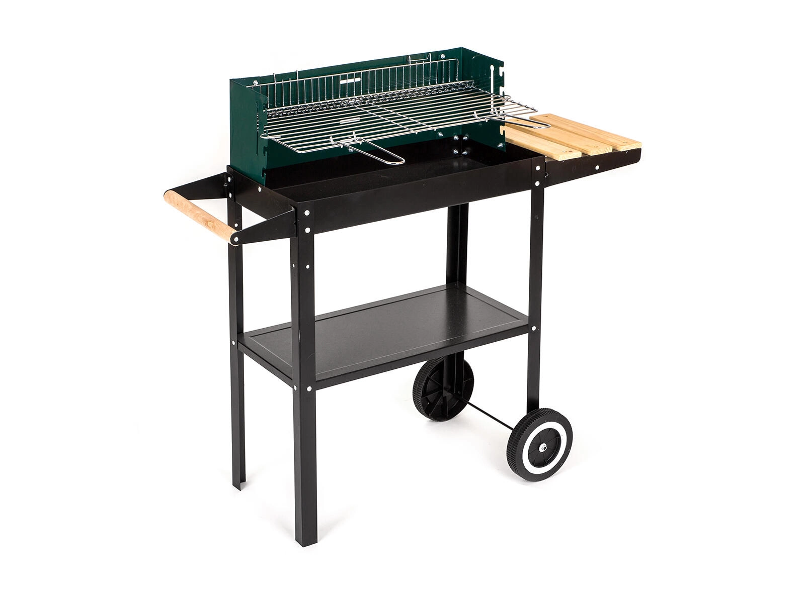 Robusta griglia da giardino a carbone con ruote di trasporto e braciere regolabile per un controllo perfetto della temperatura. Offre una griglia cromata e una griglia scaldavivande cromata per appoggiare e mantenere in caldo i cibi, ideale per grigliare su terrazza e in giardino.