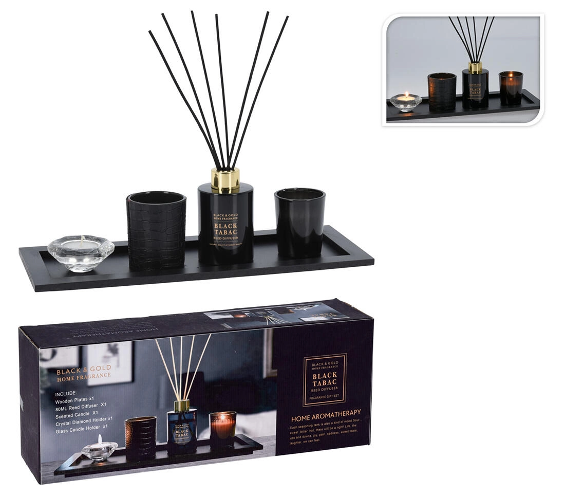 - Dotazione completa: diffusore, candela in vetro, 2× portacandela in vetro, vassoio in legno