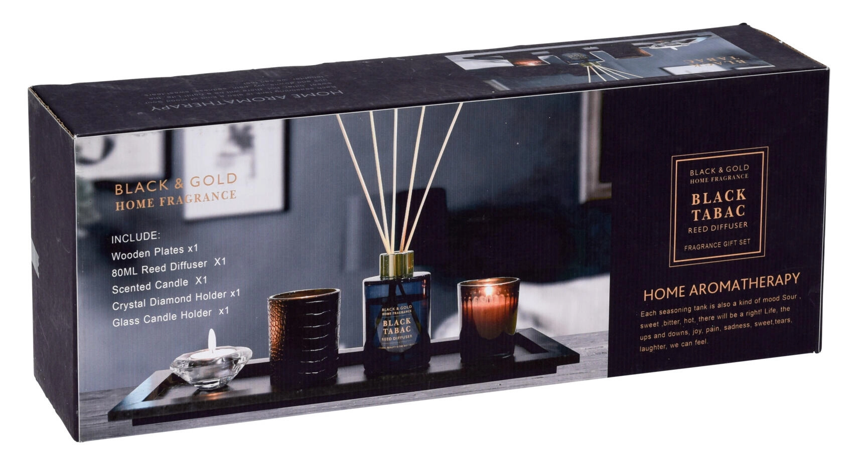 Elegante set regalo che combina diffusore di aromi, candela in vetro e portacandele in vetro su un vassoio in legno. Crea a casa una calda atmosfera con una profumazione intensa e un design elegante, adatto a qualsiasi interno.
