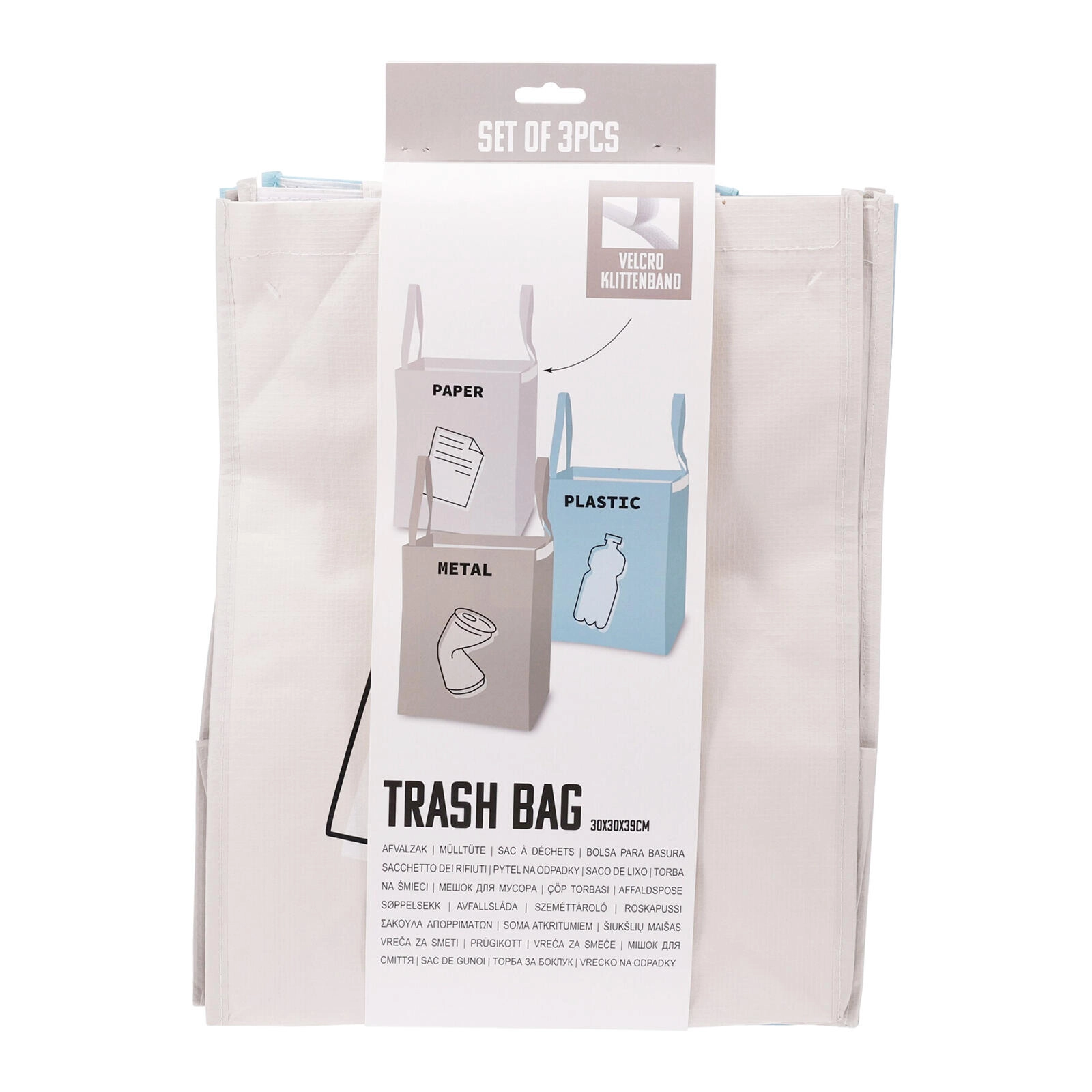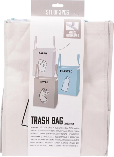 Set pratico di borse per la raccolta differenziata per casa e ufficio. Ogni borsa ha dimensioni compatte 30 × 30 × 39 cm ed è etichettata CARTA, PLASTICA e METALLO. Possono essere usate singolarmente oppure facilmente unite con il velcro in un insieme stabile per una raccolta ordinata ed efficiente.
