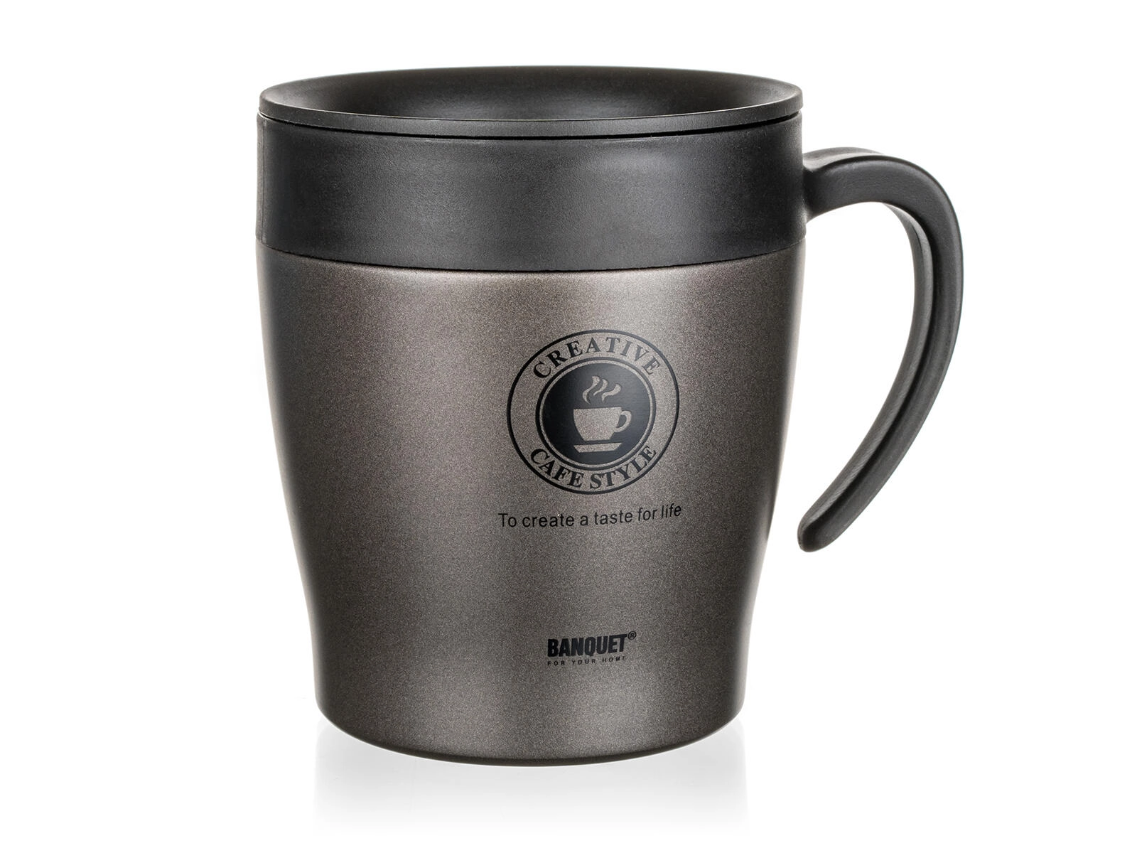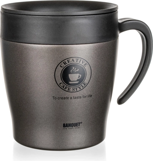 Elegante tazza termica da viaggio a doppia parete TAZZA in finitura metallizzata antracite mantiene le bevande calde o fredde più a lungo grazie alla coibentazione sottovuoto. Ha un corpo in acciaio inox resistente (esterno 201, interno 304), manico ergonomico e coperchio con anello di tenuta per ridurre il rischio di fuoriuscite durante il trasporto. La capacità di 330 ml è ideale per il lavoro, i viaggi e l’auto.