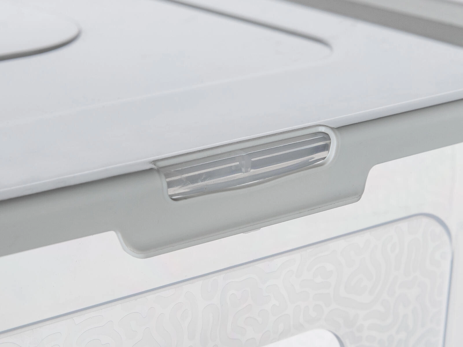La robusta struttura in plastica con maniglie laterali integrate facilita il trasporto e la maneggevolezza quotidiana. Il coperchio protegge in modo affidabile il contenuto da polvere e sporco, rendendo la scatola adatta anche alla conservazione stagionale in armadi, scaffali o cantine.
