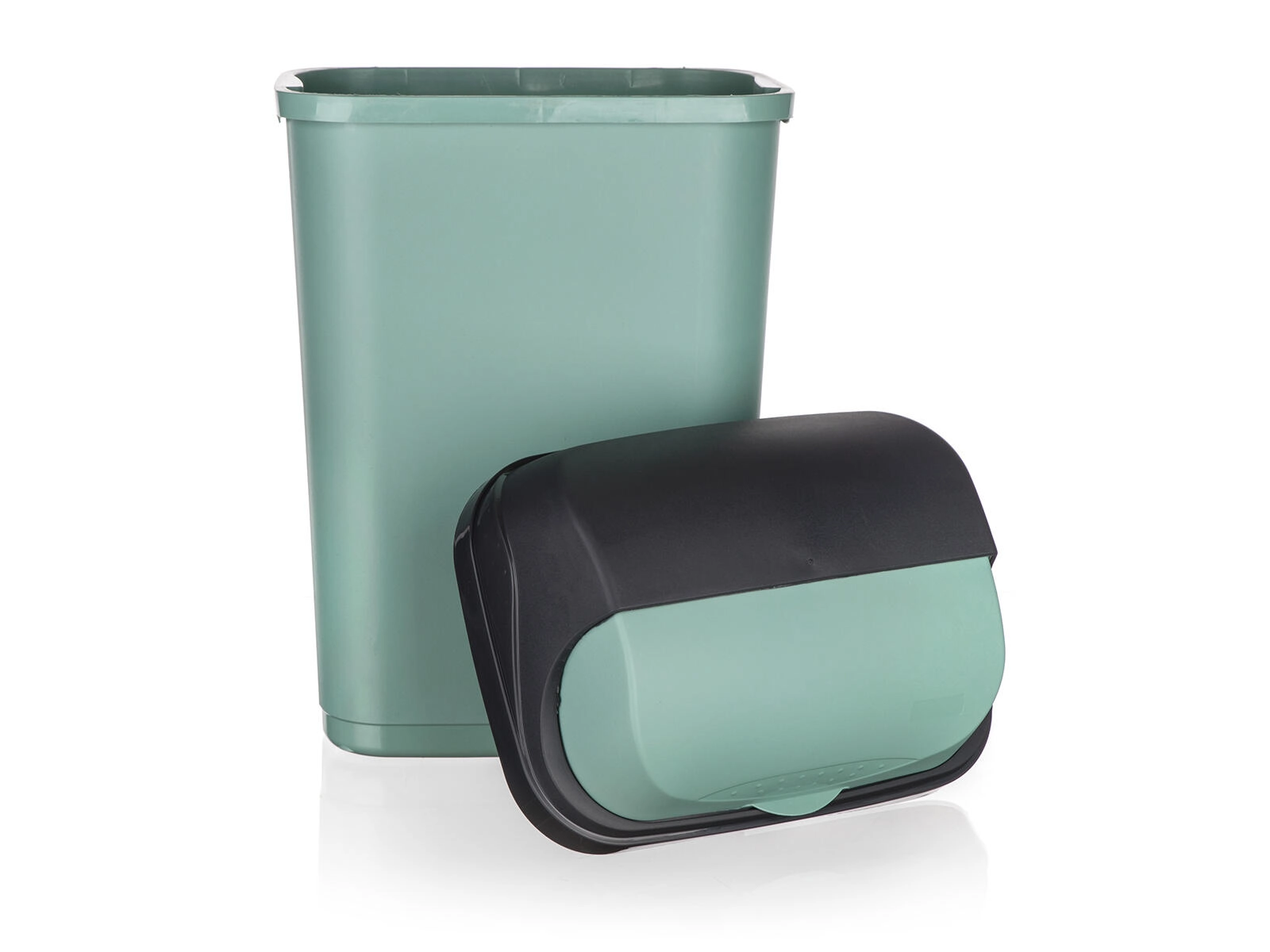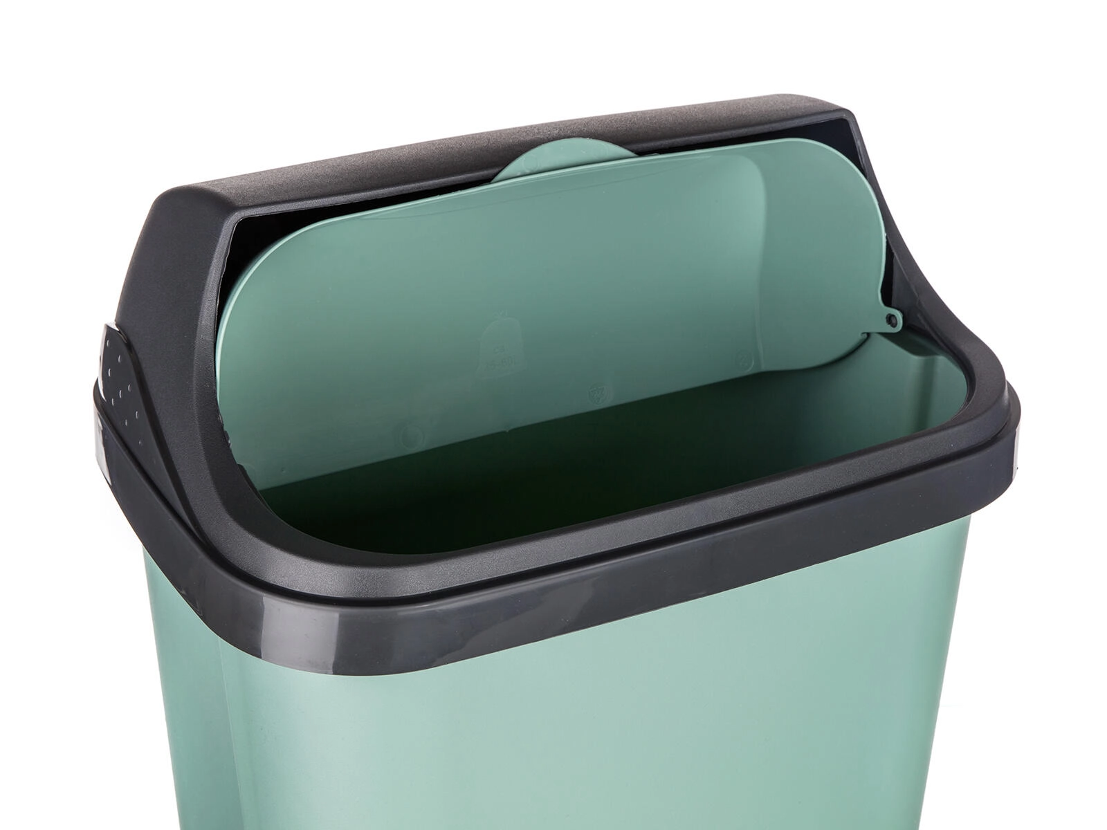 Il cestino ha una parte superiore rimovibile per un facile estrazione e sostituzione del sacchetto e un coperchio scorrevole per un uso comodo e pulito. La superficie liscia in plastica è facile da mantenere e la finitura verde si integra con stile negli interni moderni.