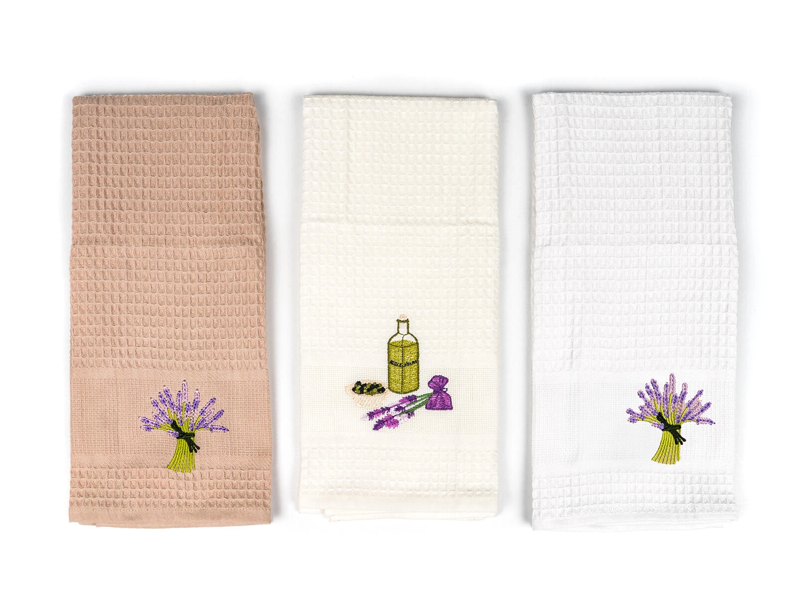 Un set elegante di strofinacci da cucina con motivo Lavender porta nella tua cucina un aiuto pratico e un tocco decorativo. La trama a nido d’ape in 100% cotone garantisce elevata assorbenza e asciugatura rapida, ideale per asciugare le stoviglie e pulire le superfici. Il mix di colori eleganti – bianco, crema e beige – si abbina facilmente a qualsiasi interno.