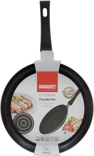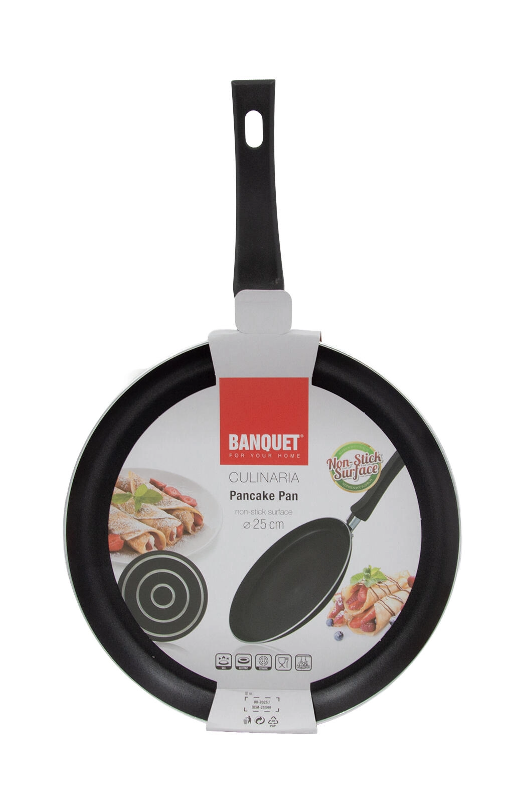 Questa padella per crêpes Culinaria è ideale per preparare crêpes sottilissime, focaccine o omelette. Il corpo in alluminio assicura un riscaldamento rapido e uniforme, mentre il bordo basso di 2,2 cm facilita il girare. Il rivestimento XYLAN a 2 strati previene le bruciature e consente di cucinare con meno grassi.